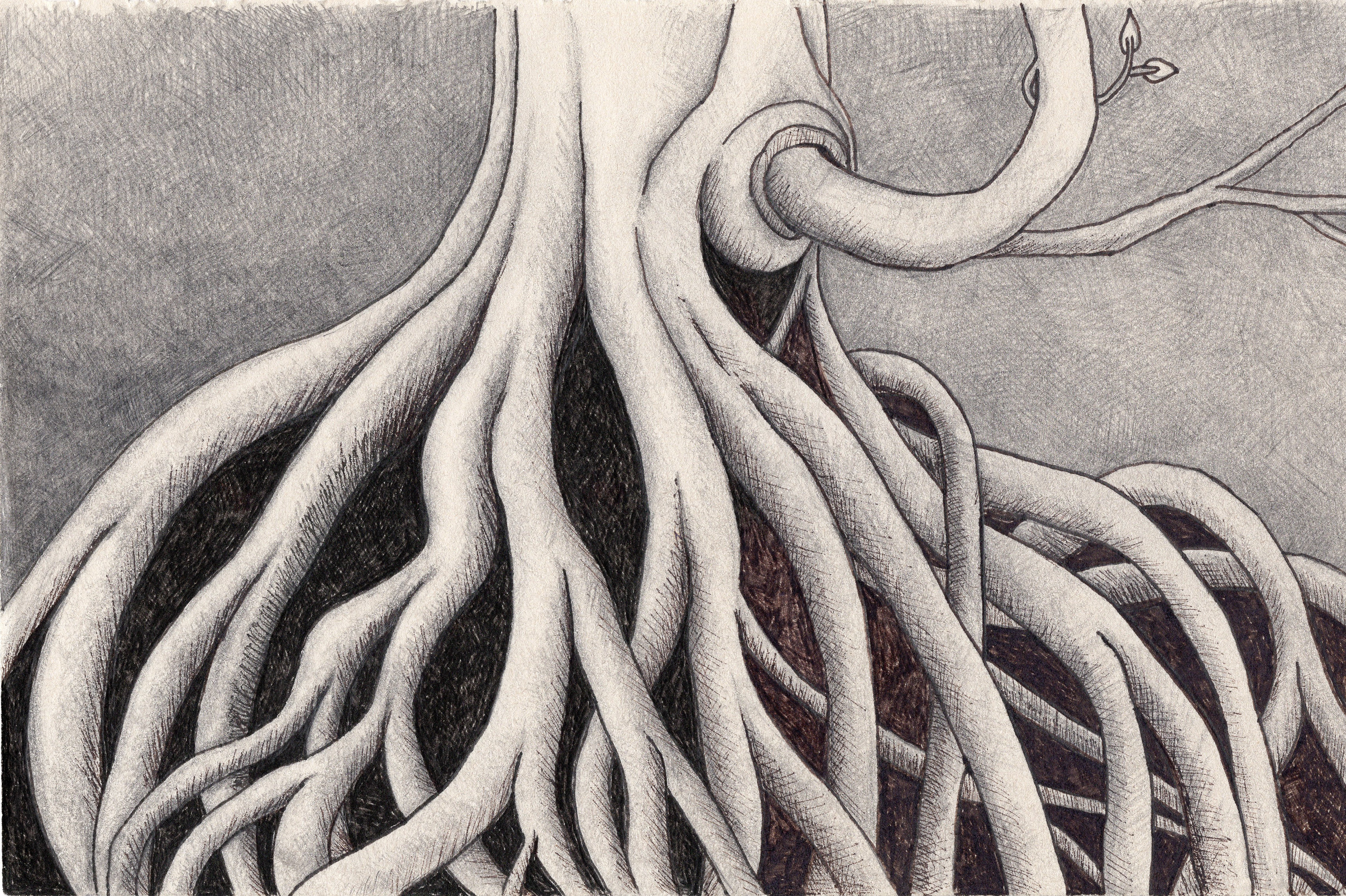 Ink pen and pencil on A4 cartridge paper, 2024. My mind was busy like the roots and drawing helped find a peaceful moment.