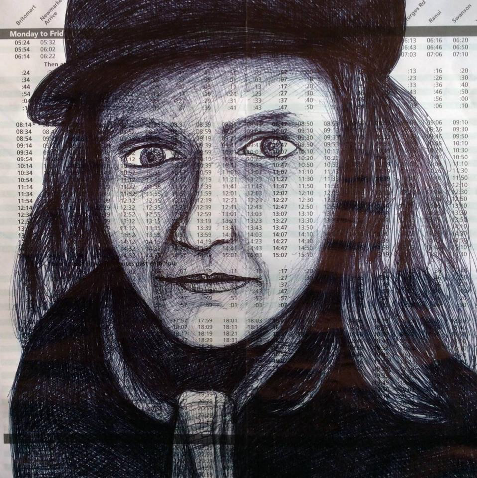 Pen on train timetable, part of 100 day project, 2016-17. During the week I did life drawing on trains and in weekends drew self portraits.