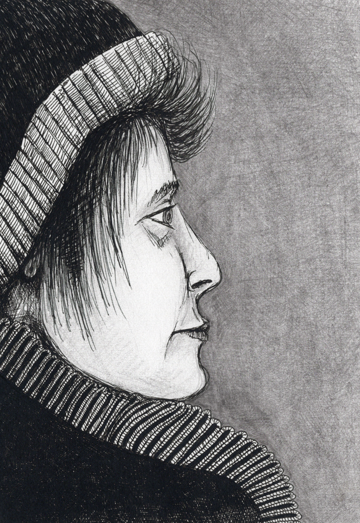Pencil and ink pen on paper. A character in my Whitecliffe illustration series.