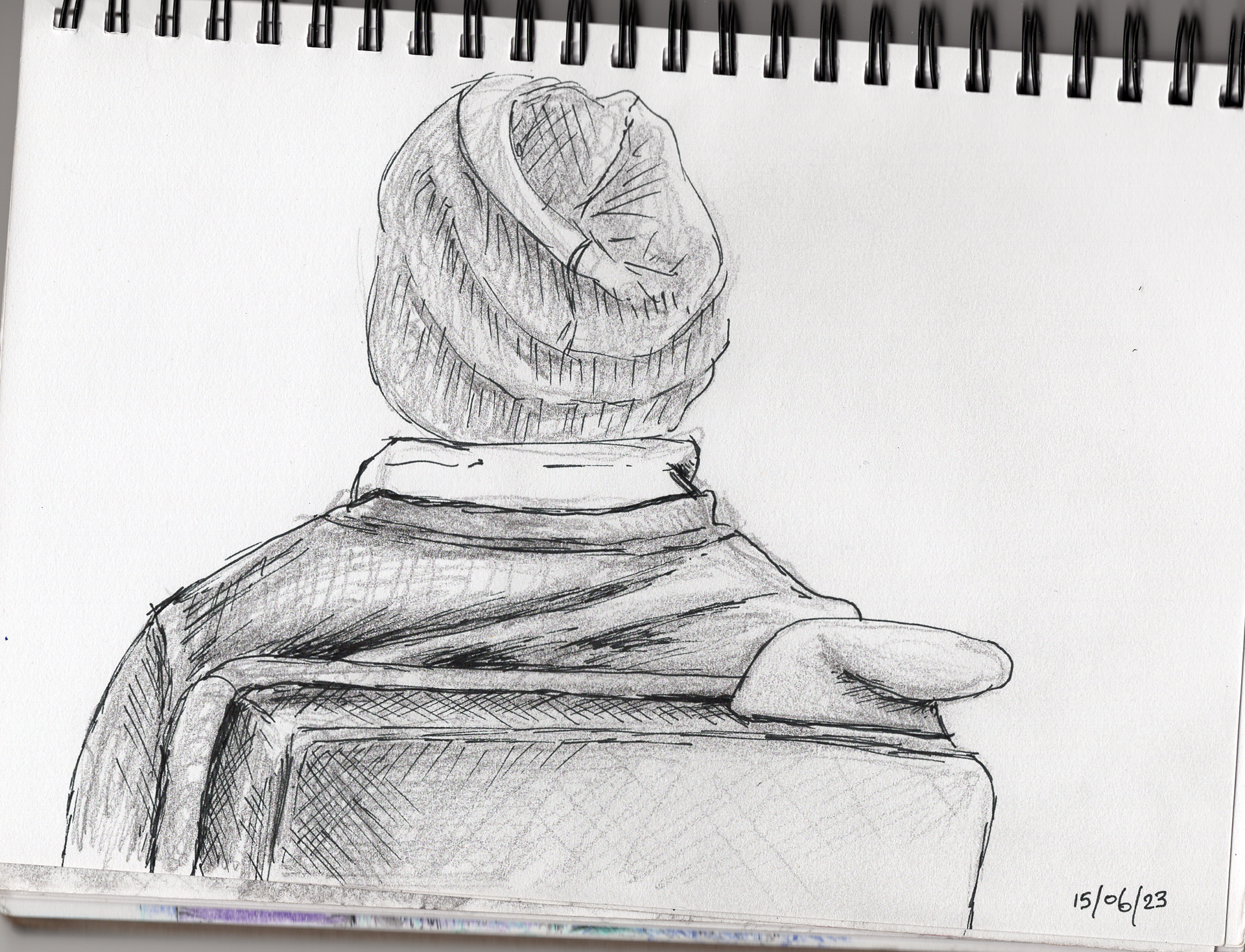 Life drawing on train, ink pen and graphite pencil in A5 notebook.