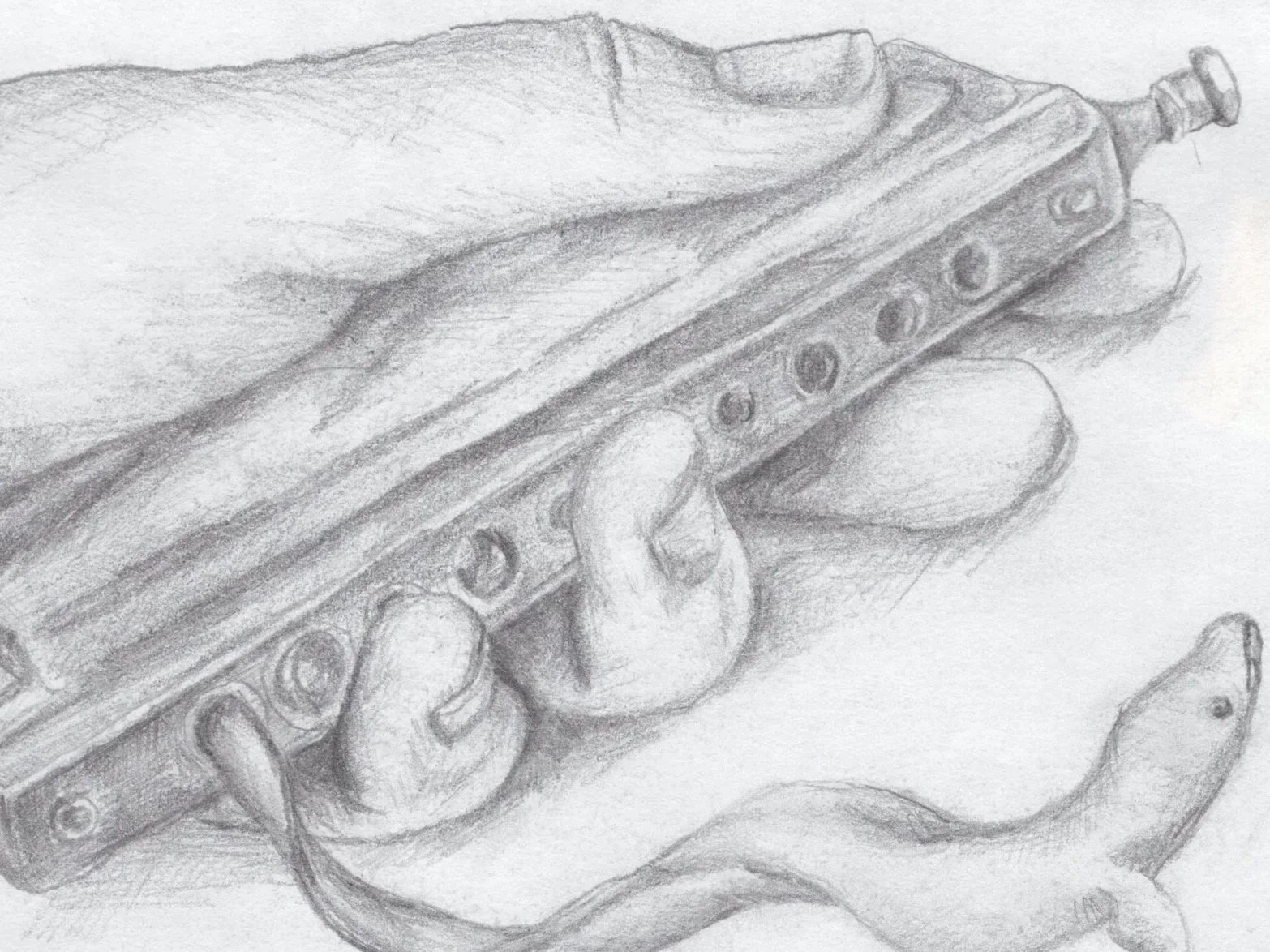 “Draw an eel coming out of your harmonica”, pencil on A4 paper, 2011. A fellow artist gave me a cue to draw.