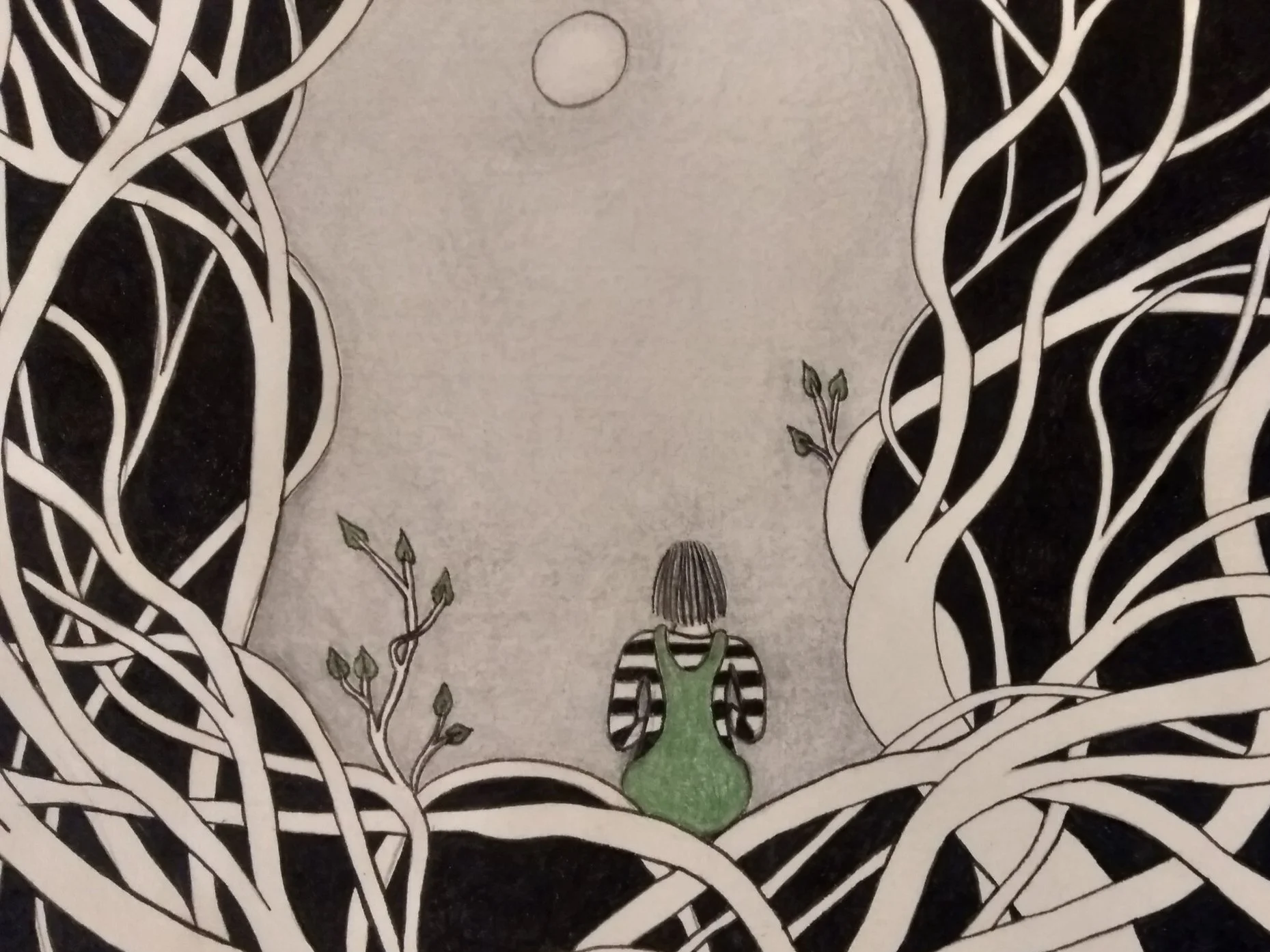 Ponder, ink pen and pencil on A4 cartridge paper, 2024. My mind was busy like the roots and drawing helped find a peaceful moment.