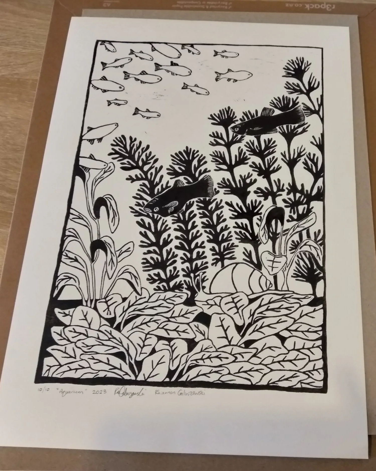 Aquarium (10 of 10), lino print for fundraising prizes for Create for Dementia fundraiser, 2023.
