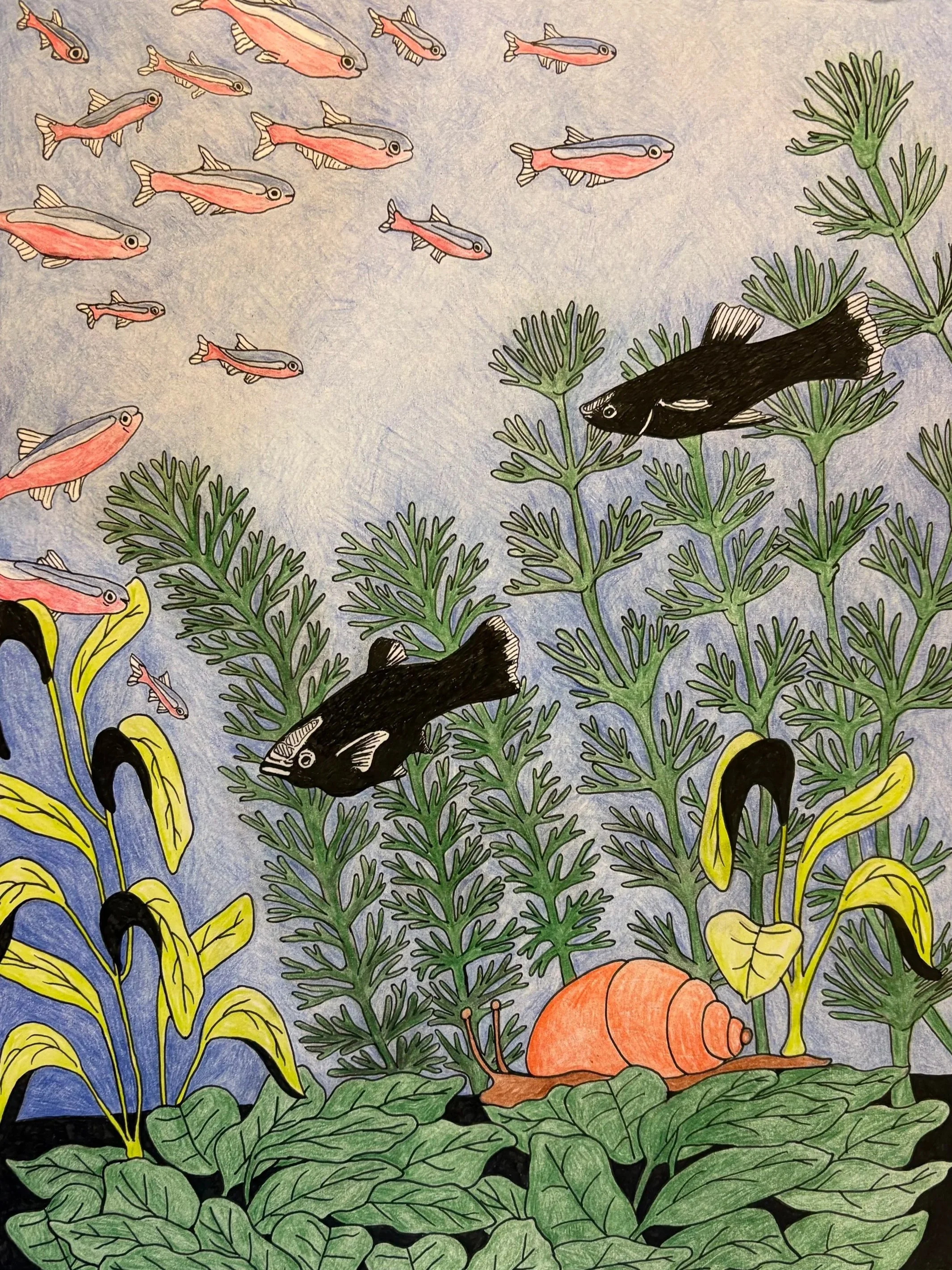 Aquarium (pre lino), mixed pencil and ink pen on A3 cartridge paper, 2023. Drawing pre-line printing for fundraising prizes for Create for Dementia fundraiser.